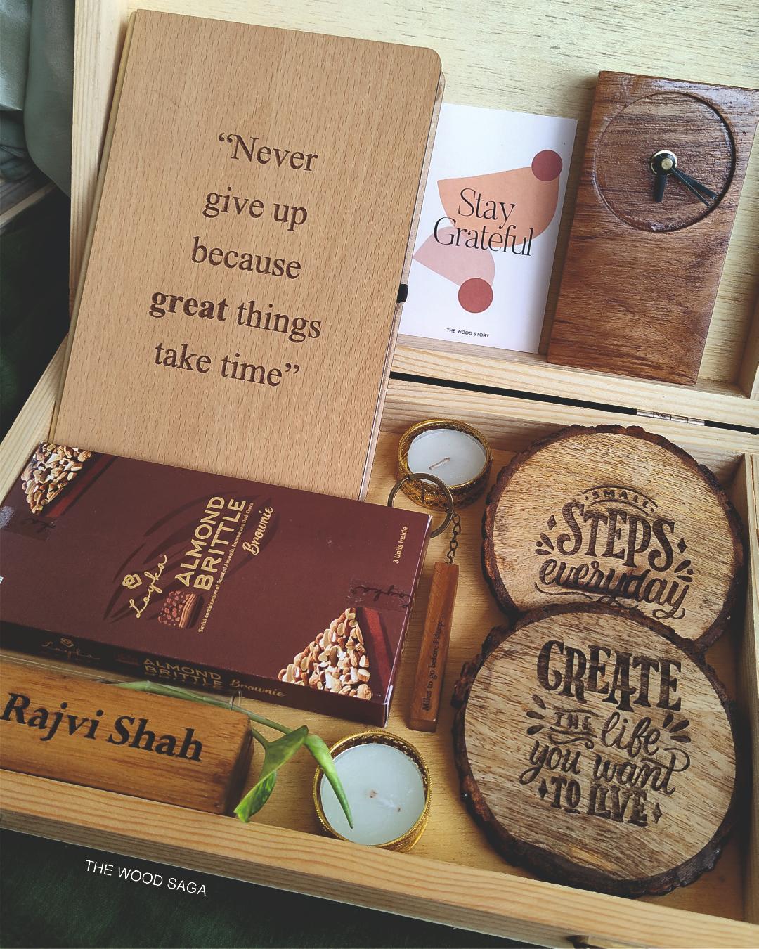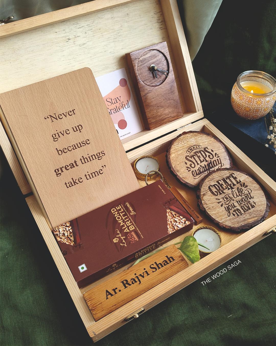 Celebrate milestones or simply uplift someone’s day with this thoughtfully curated gift box. Designed to inspire and motivate, this combo blends functionality with warmth. Whether it’s for a professional, a loved one, or a self-care gift, this wooden hamper is a timeless way to make someone feel special.