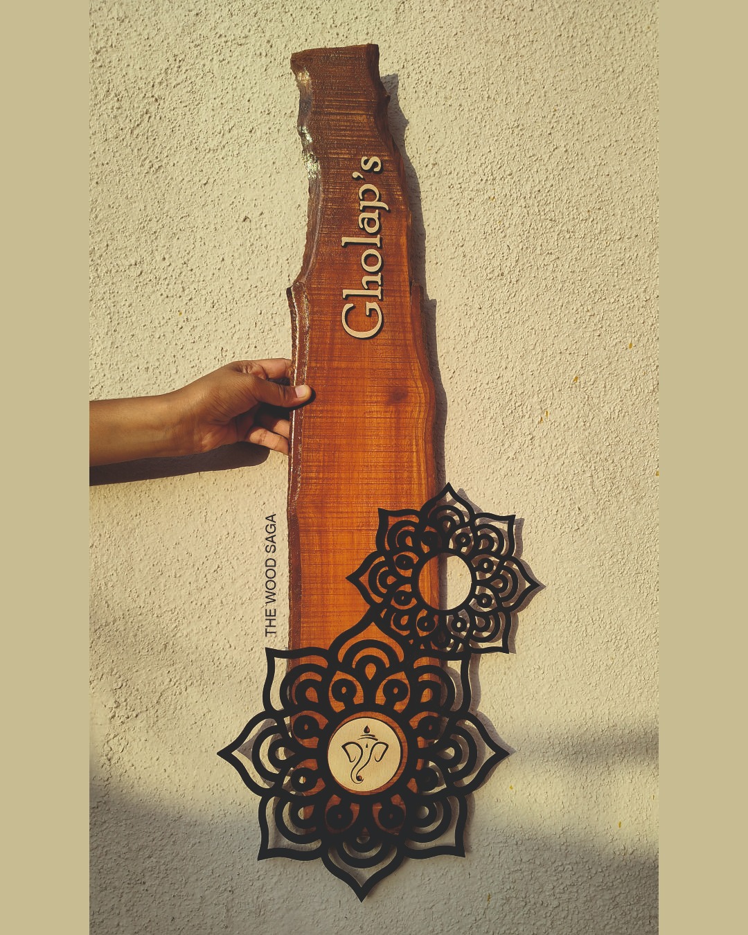 Add a touch of tradition to your home with this handcrafted wooden nameplate. Featuring a raw-edge wood base, elegant floral mandala patterns, and a divine Ganesha symbol, it blends spirituality with artistic charm. Perfect for entrance décor.