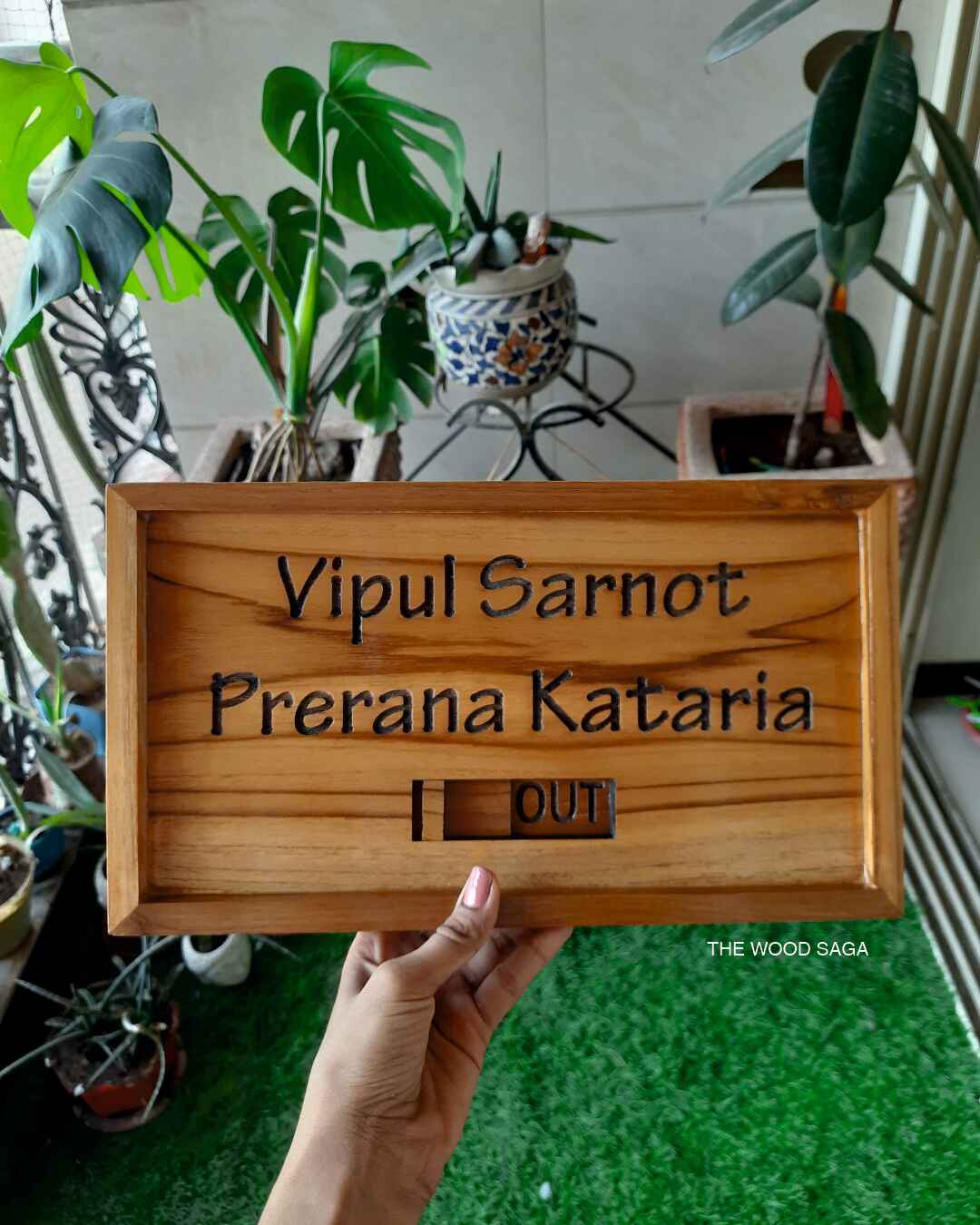 A personalized wooden nameplate with a unique IN/OUT slider, perfect for home entrances. Crafted from premium wood, it adds warmth and functionality, letting visitors know if you’re available. A stylish and practical touch for your doorway!