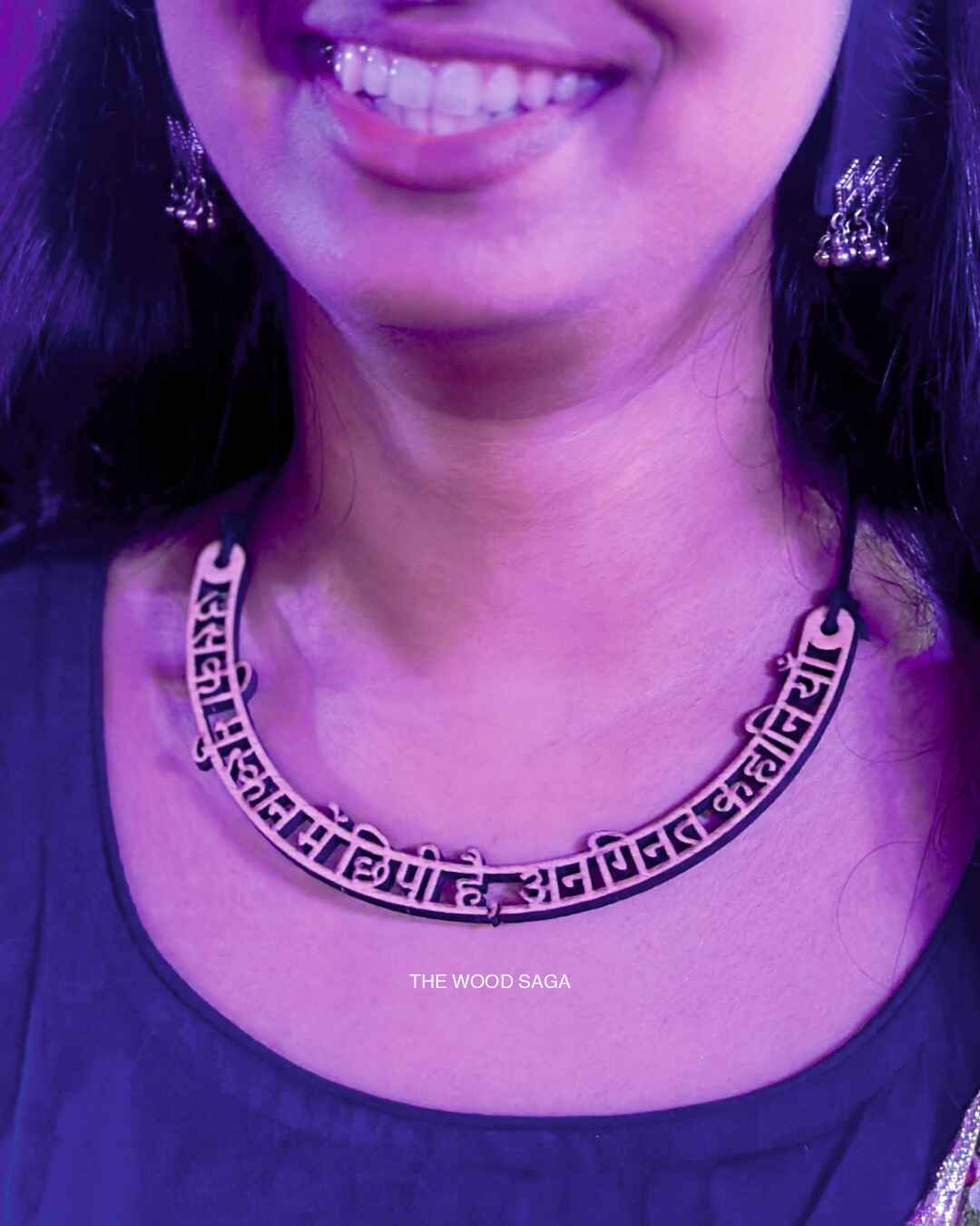 This intricately designed wooden neckpiece is a fusion of tradition and contemporary style. Featuring finely engraved Hindi script, it beautifully conveys emotions while adding a unique touch to your ensemble. Crafted with precision, it’s lightweight, sustainable, and effortlessly stylish—perfect for those who love to wear art with meaning.