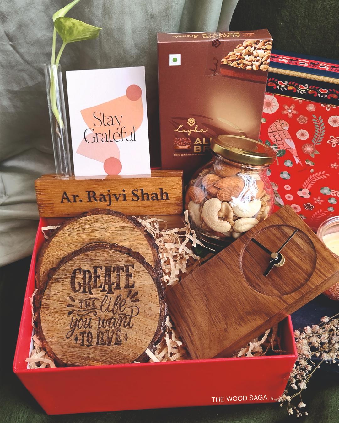 Includes – Wooden clock, 2 wooden coaster, Personalized table top planter, Dry fruit jar, chocolate brittles.