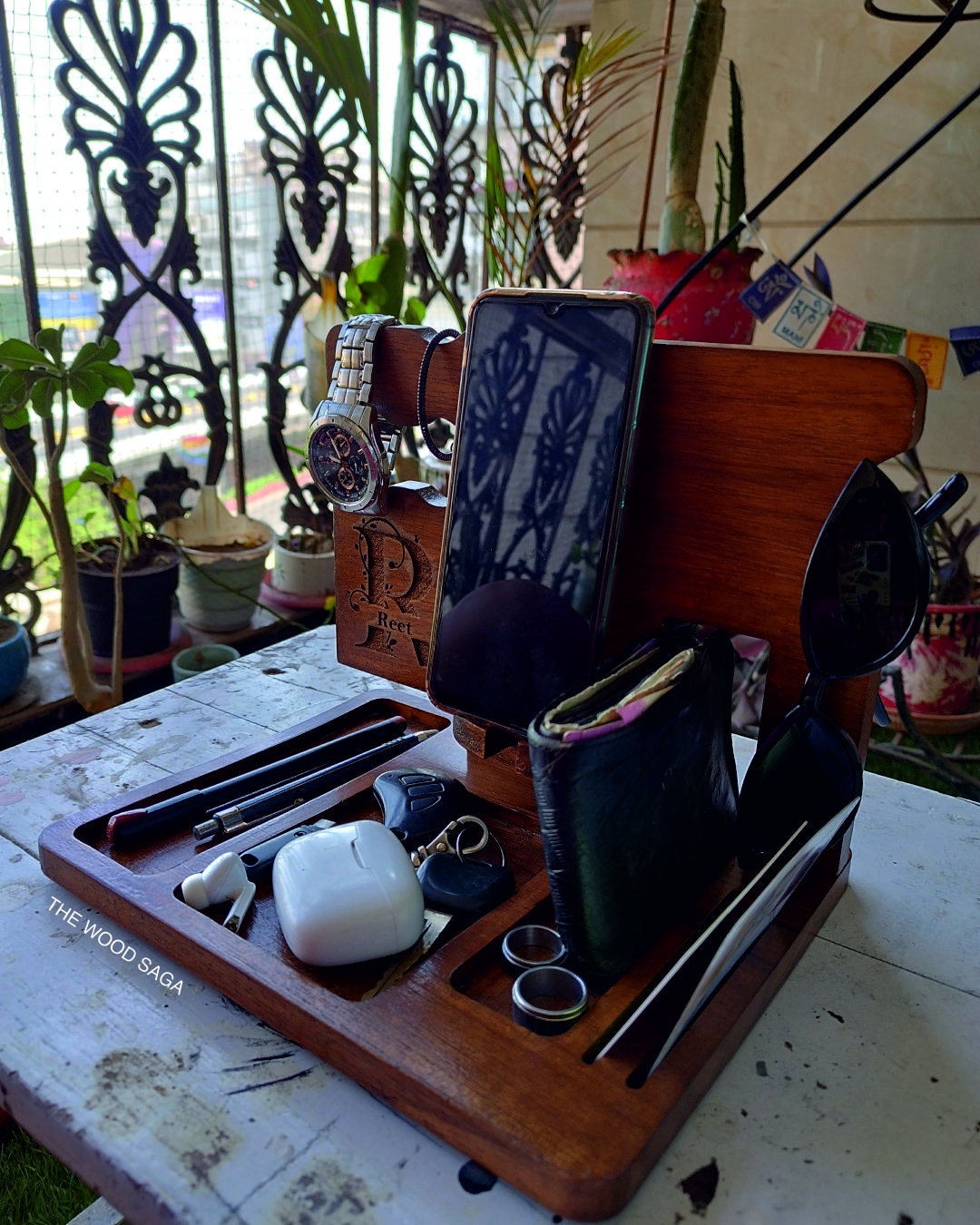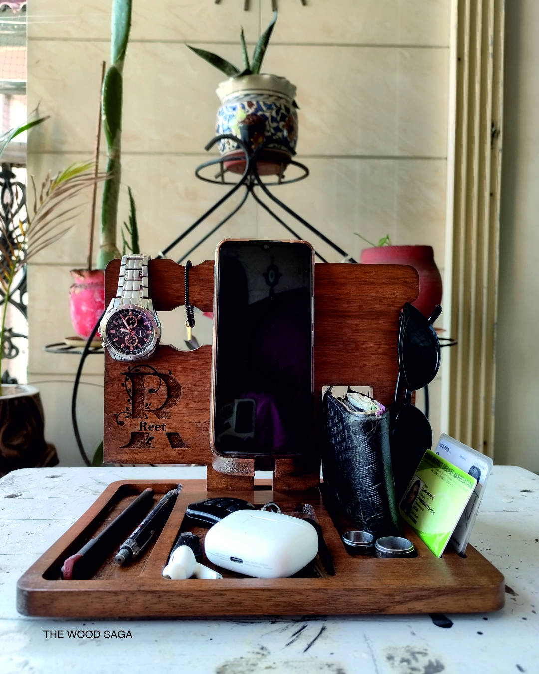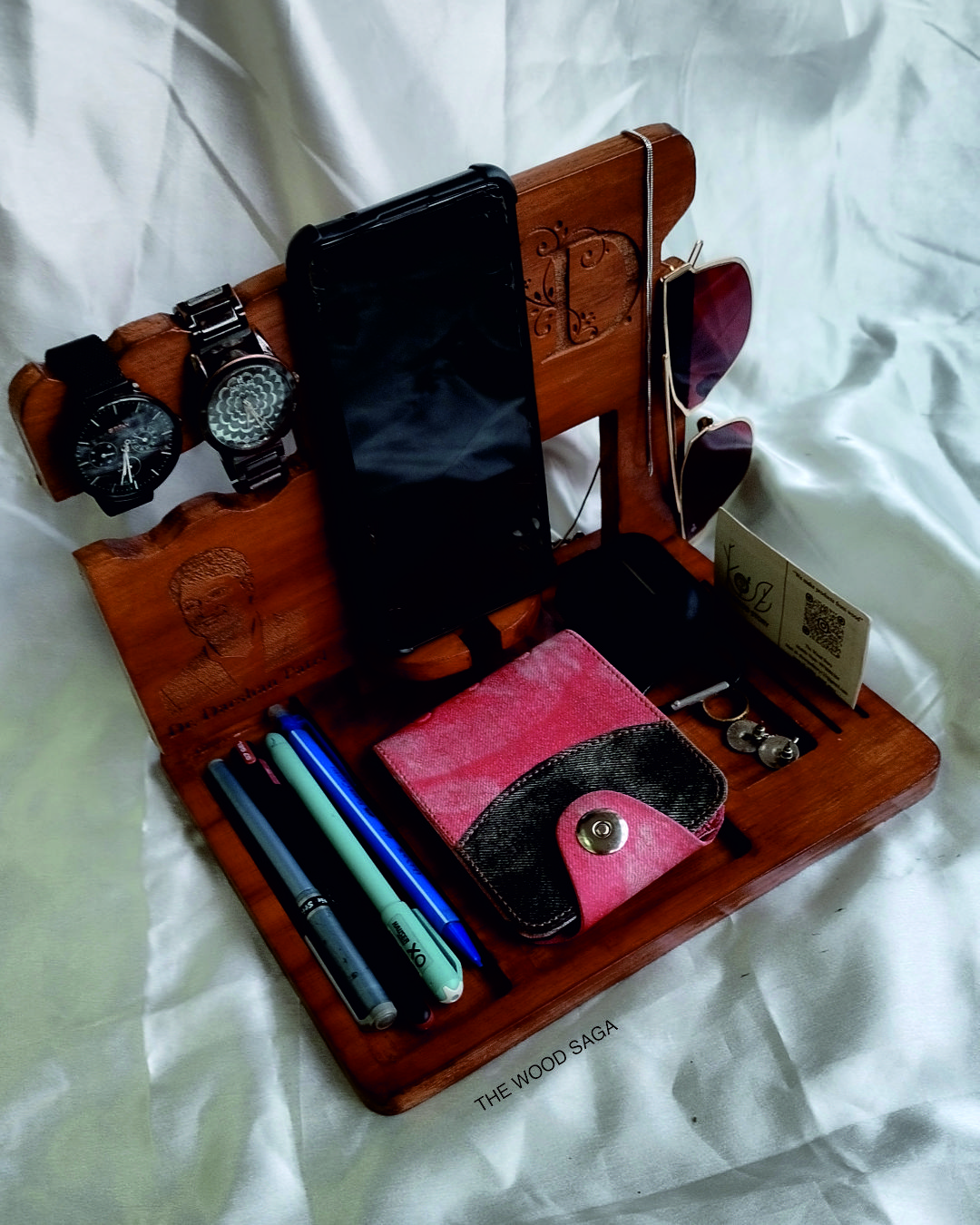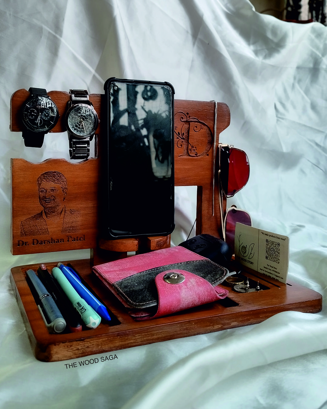 A sleek and functional wooden desk organizer designed to keep your essentials in one place. It features dedicated slots for your phone, wallet, watch, pens, sunglasses, and more. With a personalized engraving option, it adds a touch of elegance to your workspace or bedside table.