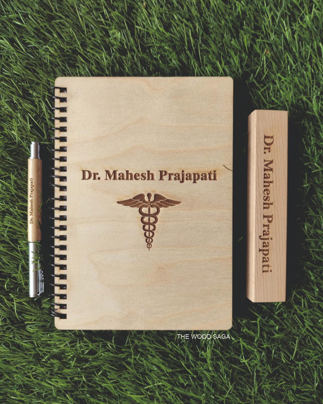 Crafted with purpose and precision, this custom wooden diary set is the perfect companion for healthcare professionals who appreciate functionality wrapped in elegance. Featuring a precisely engraved Caduceus symbol and the doctor’s name, this set includes a spiral-bound wooden diary, a personalized pen, and a matching name-engraved wooden pen case.