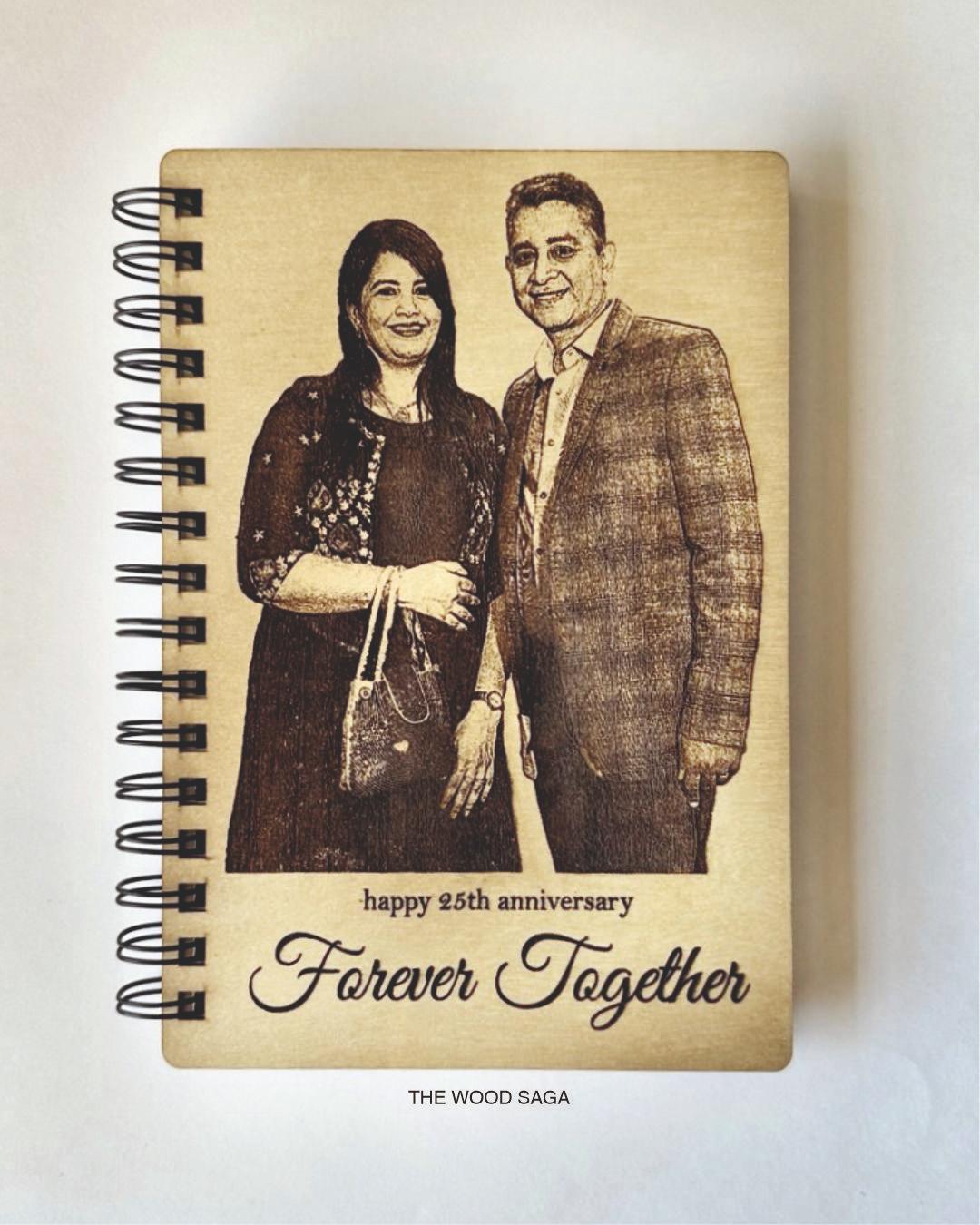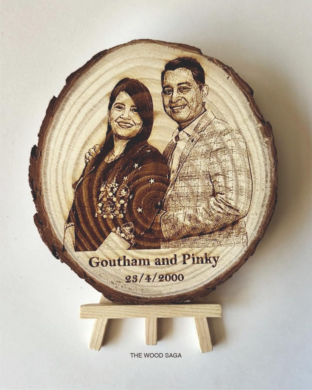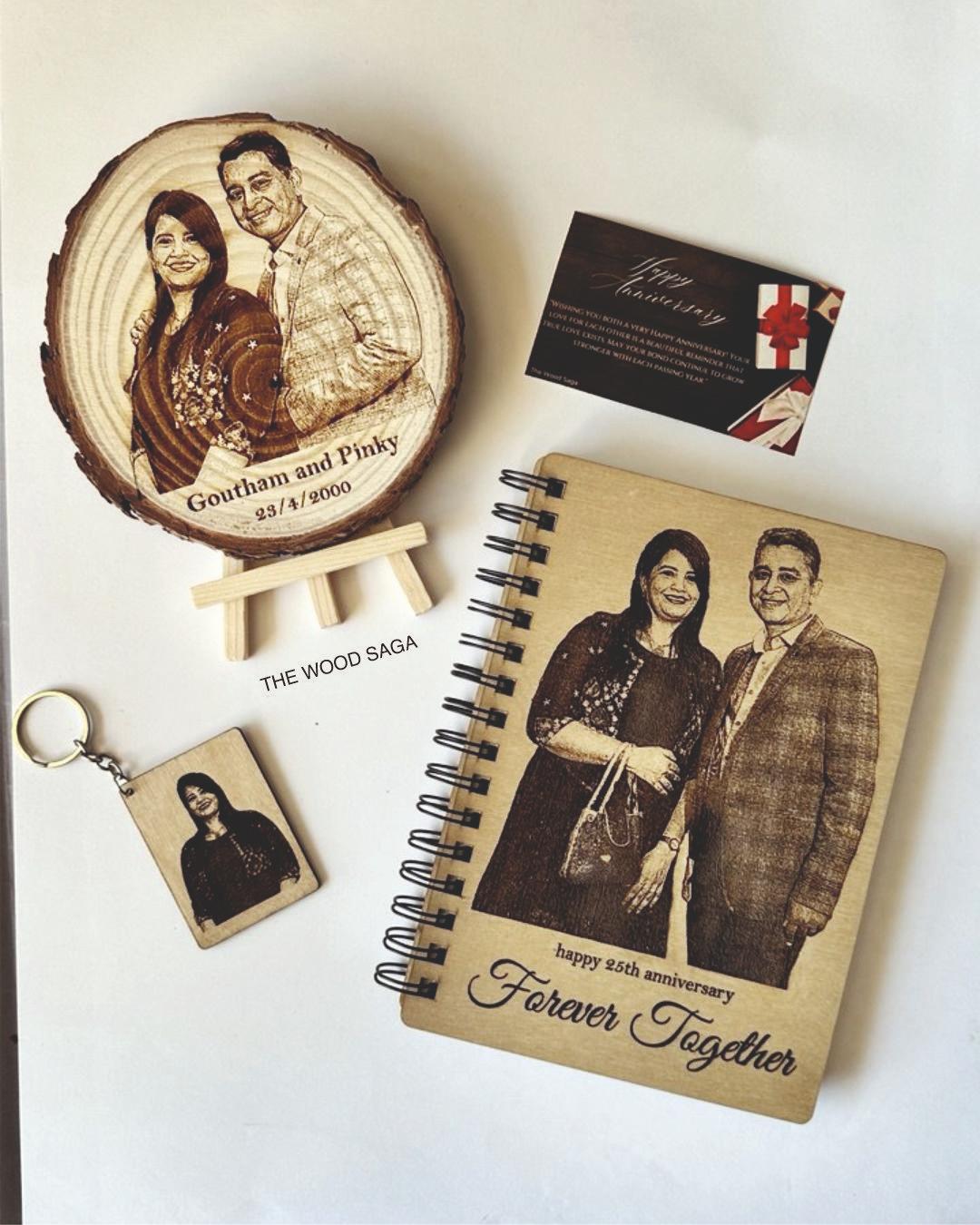 Mark the milestones of love with this elegant anniversary combo from The Wood Saga. Thoughtfully curated with a personalized photo-engraved wooden diary, matching keychain, a stunning wooden log frame on an easel, and a heartfelt anniversary message card — this set captures the essence of lasting togetherness. Whether it’s your 1st or 25th, gift memories that last forever, just like your bond.