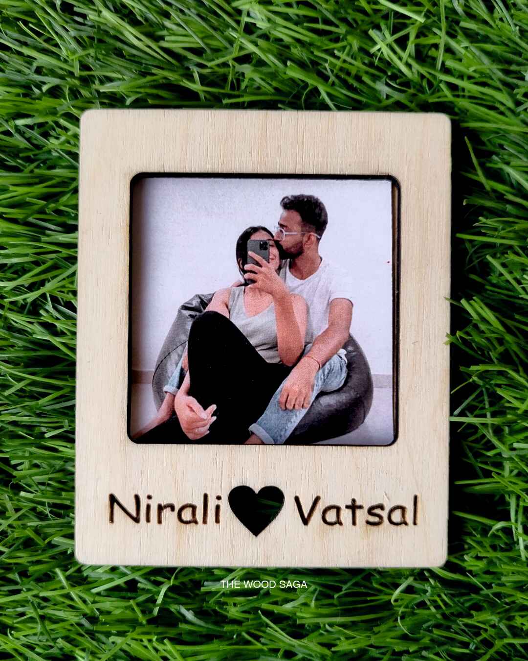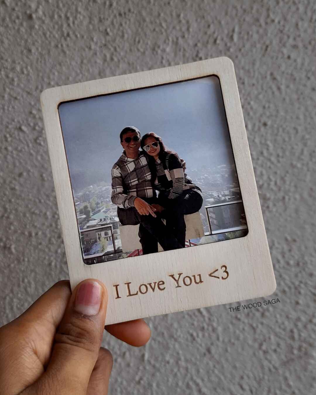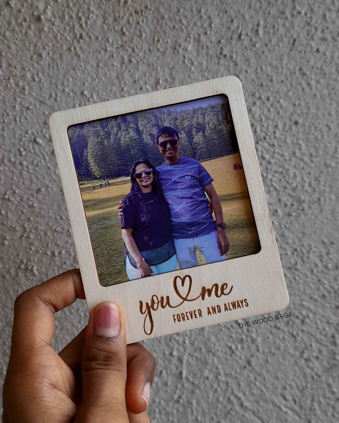 A wooden polaroid fridge frame is a stylish and sustainable way to display your favorite memories. This frame is crafted from wood and features a magnet for easy attachment to your fridge or any metal surface. It can be personalized with engraved names, dates, or quotes, adding a sentimental touch to your cherished moments.