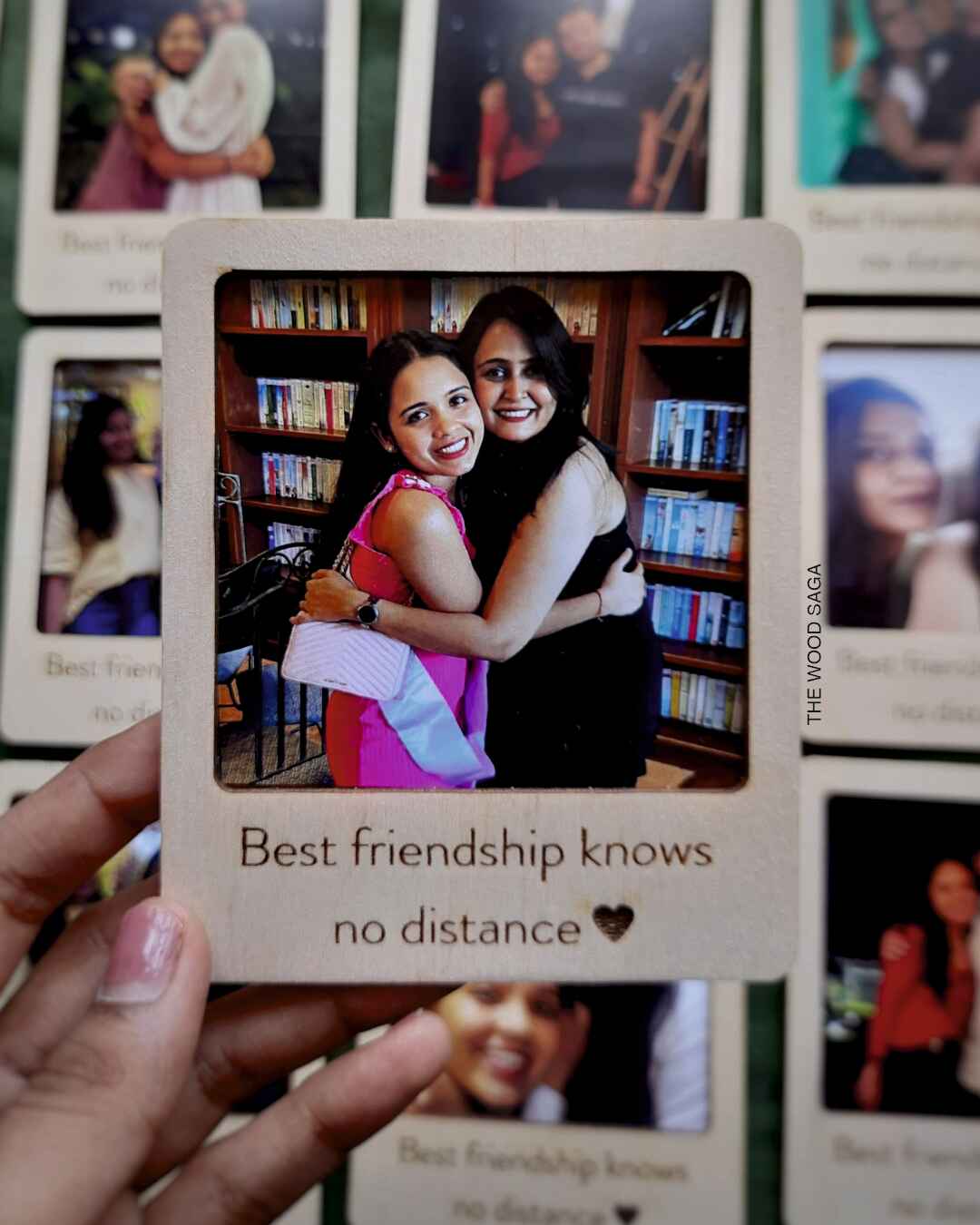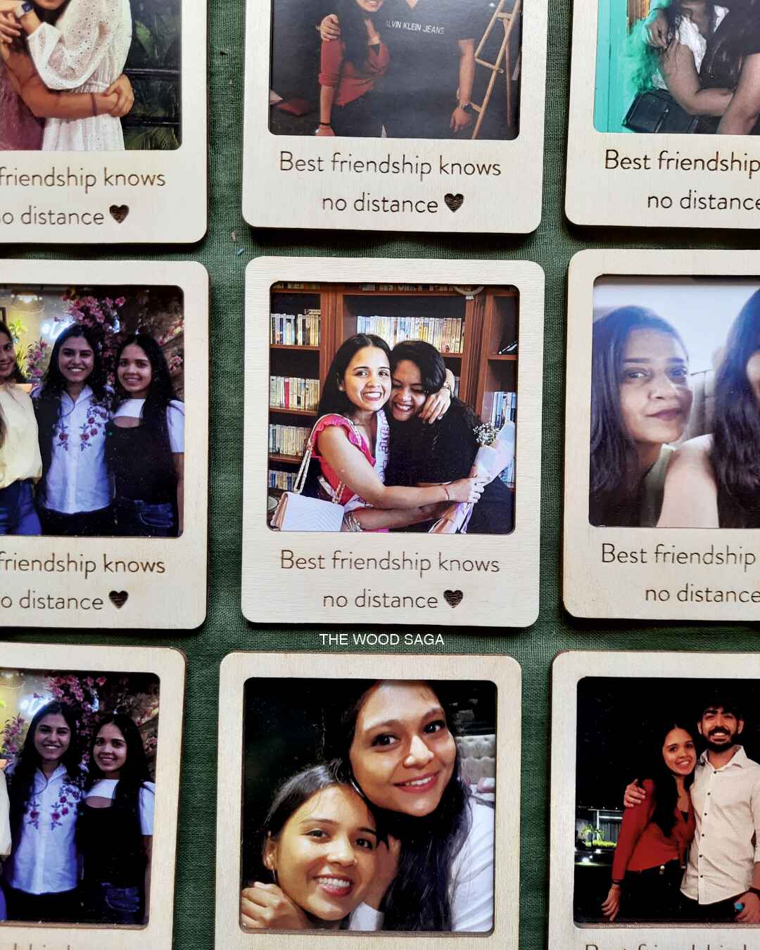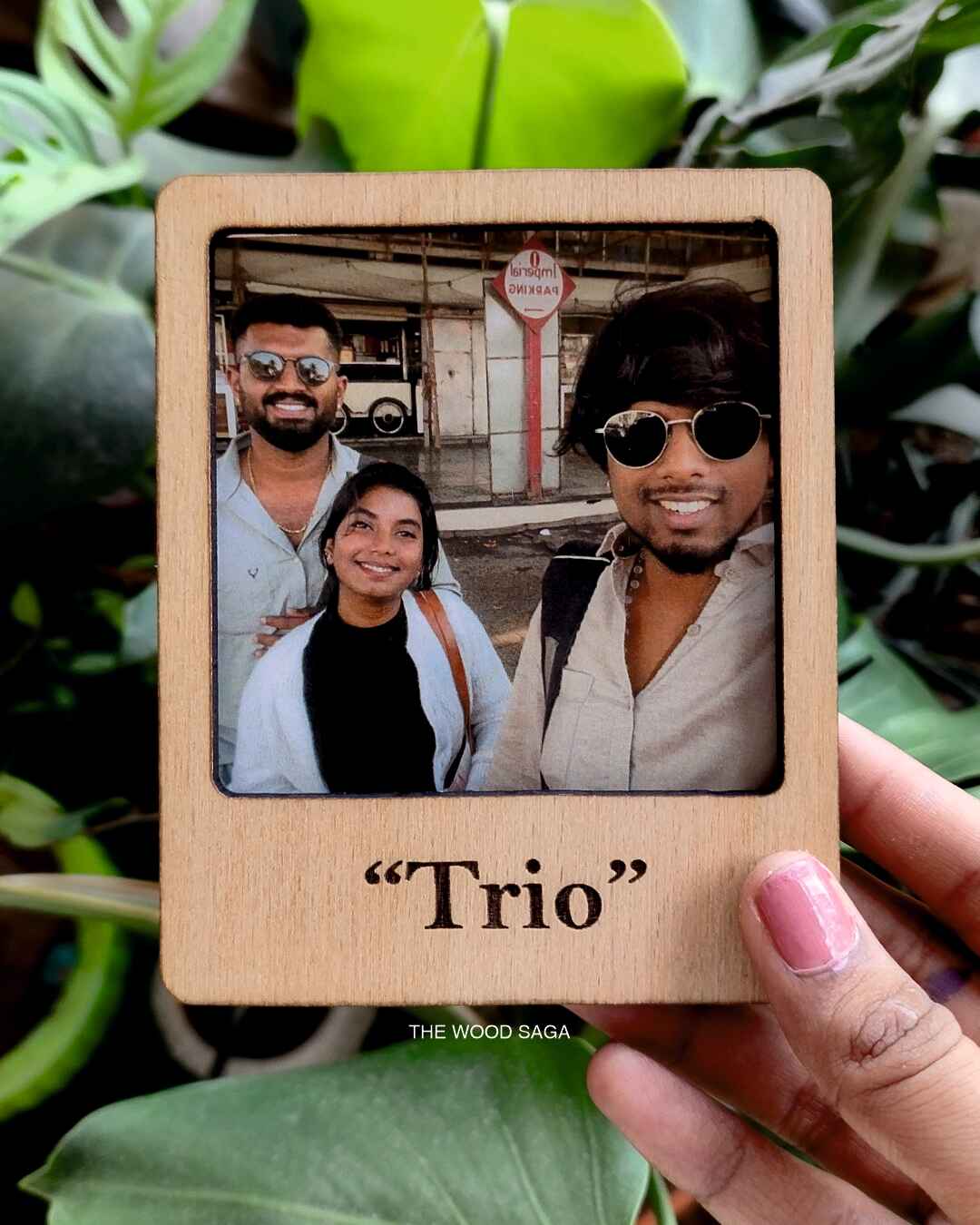 A wooden polaroid fridge frame is a stylish and sustainable way to display your favorite memories. This frame is crafted from wood and features a magnet for easy attachment to your fridge or any metal surface. It can be personalized with engraved names, dates, or quotes, adding a sentimental touch to your cherished moments.