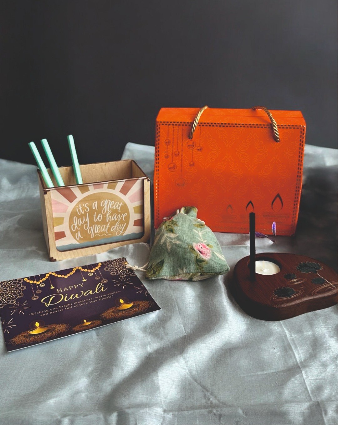 This Diwali, gift more than just presents—share the joy of sustainable celebrations with our thoughtfully curated Diwali hamper. Designed to blend tradition with modern elegance, this eco-friendly gift box includes premium festive essentials that inspire positivity, wellness, and togetherness. Perfect for corporate gifting or personal celebrations, this hamper is a meaningful way to spread festive cheer while making conscious choices for a brighter tomorrow.