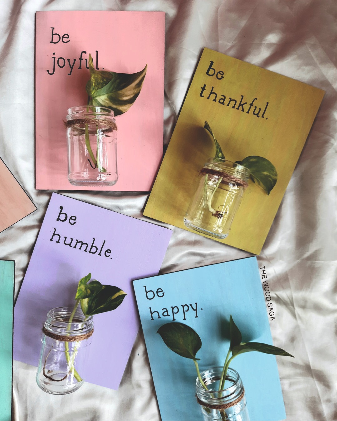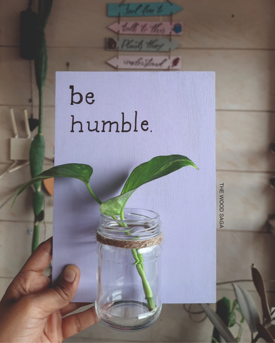 These hand-painted pastel wooden boards paired with minimal glass jar planters add a touch of freshness and warmth to any space. With soft tones and a positive vibe, they make for perfect home decor or thoughtful return gifts that leave a lasting impression.