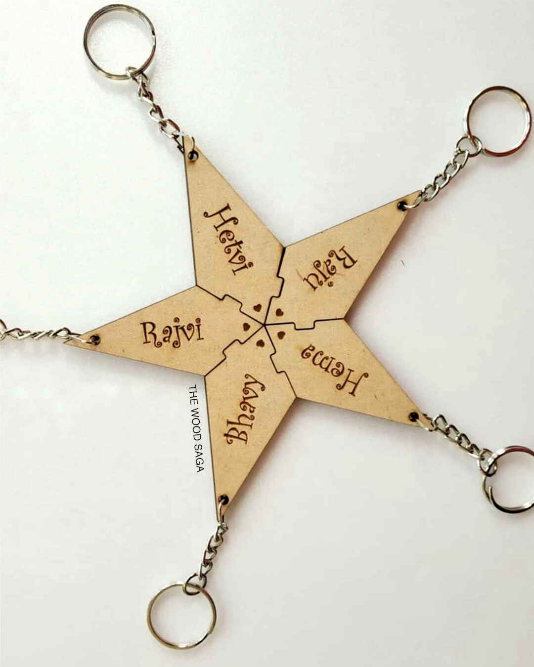 Celebrate the people who complete your universe with our handcrafted Star Puzzle Keychain – a beautifully interlocking set of five wooden keychains that come together to form a perfect star. Each piece is engraved with a name, making it a meaningful keepsake for best friends, siblings, cousins, or teammates.